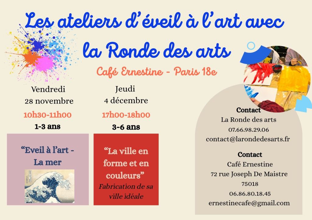 La Ronde des Arts travaille en collaboration avec Ernestine Café situé au 72 rue Joseph de Maistre à Paris. Bérengère qui a créé la Ronde des Arts en 2025, propose des ateliers d’éveil artistique pour les bébés et les enfants à partir de 3 ans. Ces ateliers sont ludiques et sensoriels et permettent à l’enfant de s’exprimer dans un cadre chaleureux et convivial. Ils durent 30 à 45 minutes pour les bébés et 1h00 pour les enfants.