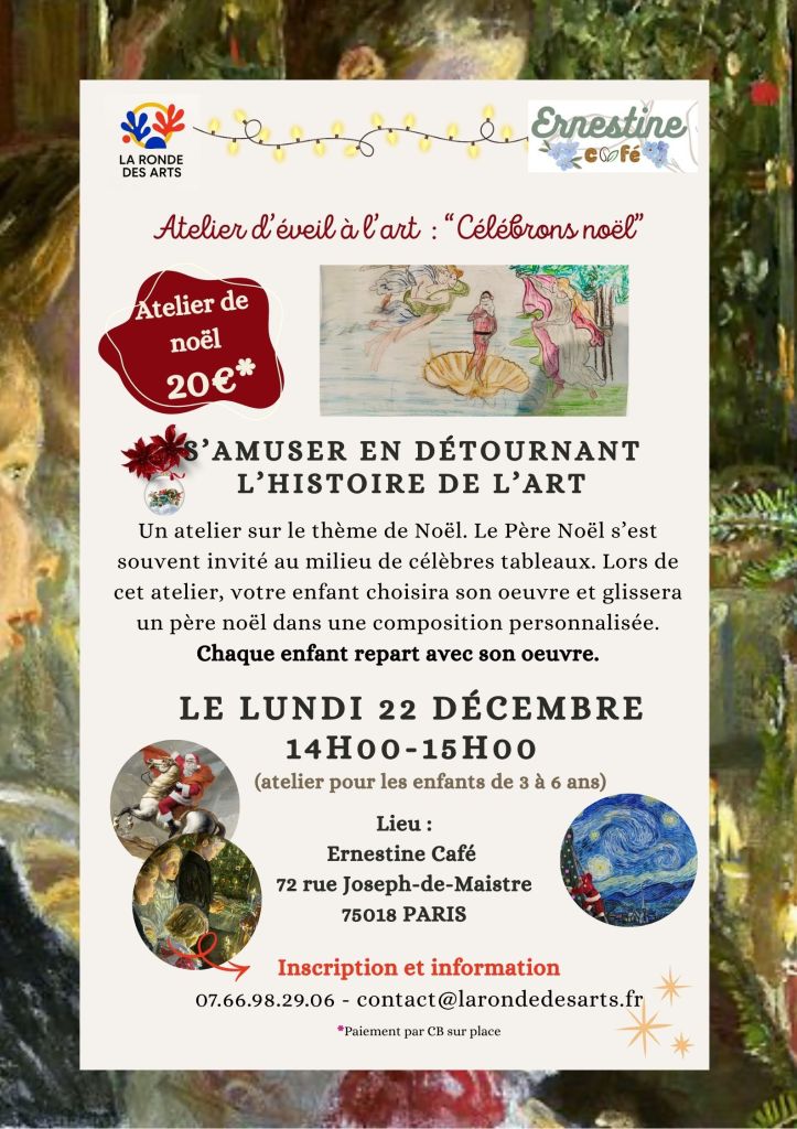 Les ateliers la Ronde des Arts au sein du Café Ernestine sont imaginés par Bérengère et la création du contenu et confection du décor sont sur mesure. Ils peuvent être en lien avec une thématique artistique, une oeuvre, un artiste ou un lieu culturel. Tous les ateliers comprennent le matériel. Le paiement des ateliers se fait par carte bancaire sur place le jour de l’atelier.