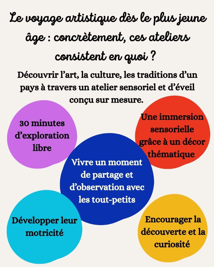 J’ai créé la Ronde des Arts en 2025 avec pour objectif de transmettre ma passion pour les arts aux plus jeunes. Les ateliers d’éveil artistique pour les bébés me tiennent à coeur puisque l’art commence dès le plus jeune âge par la découverte des couleurs ou encore des textures qui font partie de leur quotidien. Voir un bébé interagir par son regard, son sourire, ses grimaces dans une ambiance artistique et sensorielle est une richesse pour l’intervenante et les parents.